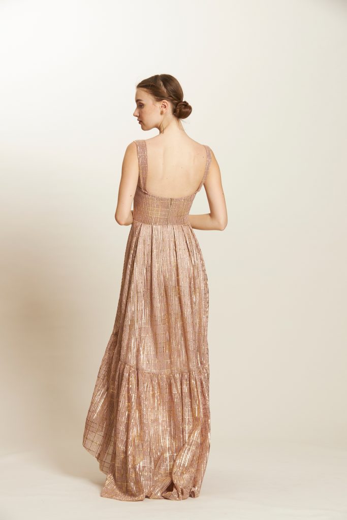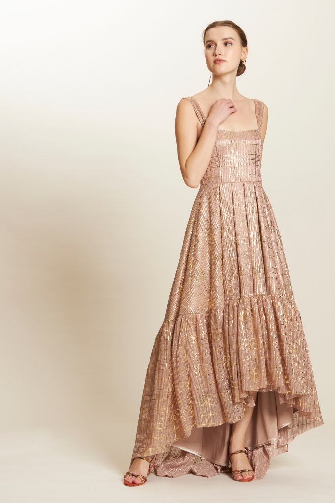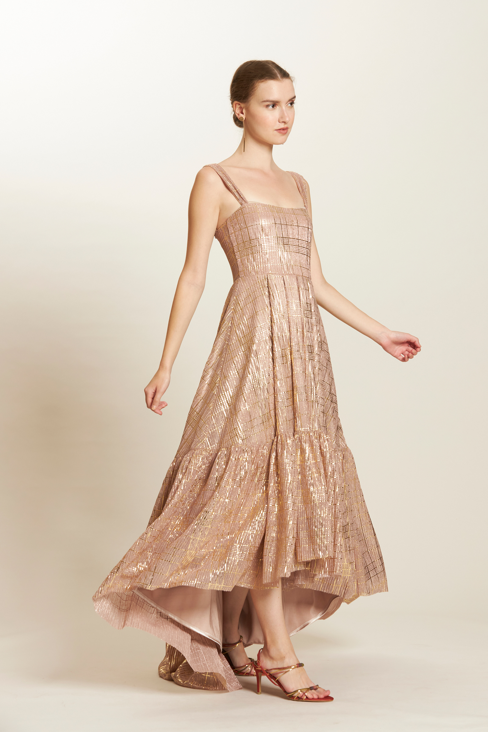 foiled plaid motif pleated dip hem tier dress